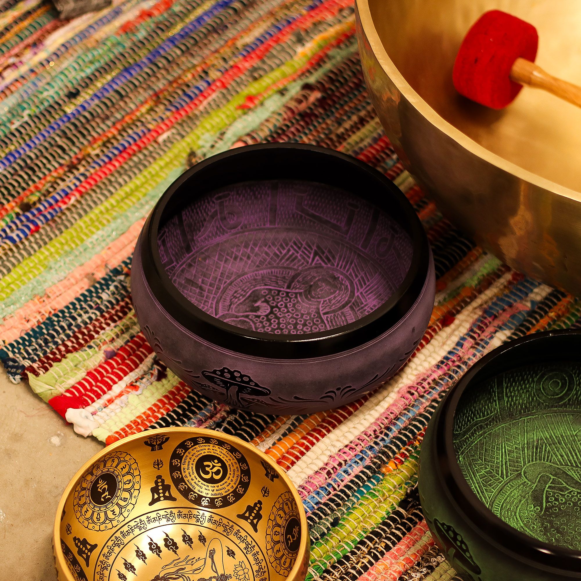 Bring a bold visual and acoustic presence to your meditation space with the Purple Haze Mushroom Singing Bowl. This striking purple brass bowl is designed to produce an extra-loud, sustained tone – perfect for sound therapy, yoga, or focused meditation sessions.