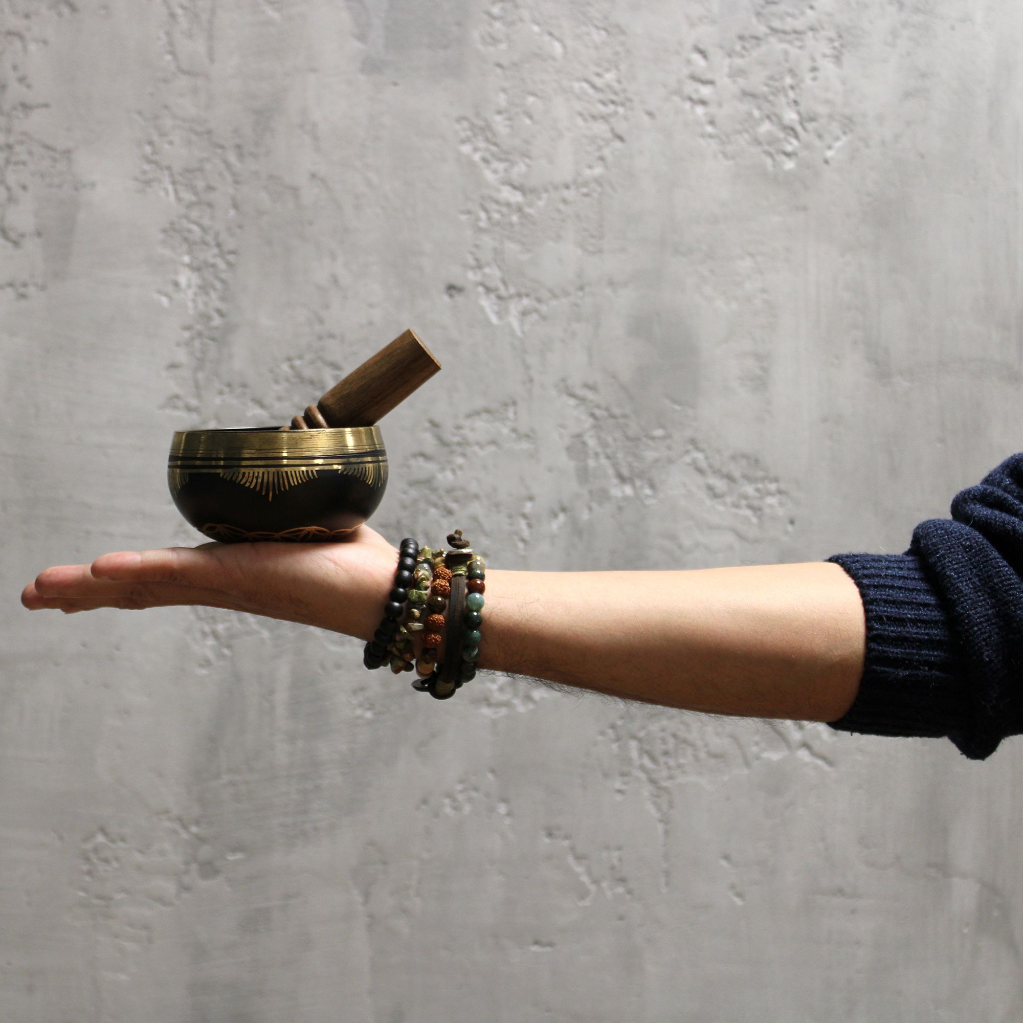 Singing bowls are a type of bell, rather than hanging inverted or attached to a handle, the singing bowls sit with the bottom surface resting. The sides and rim of singing bowls vibrate to produce sound. Use the wooden end of the stick to make the bowl sing. The padded end make a divine dong.