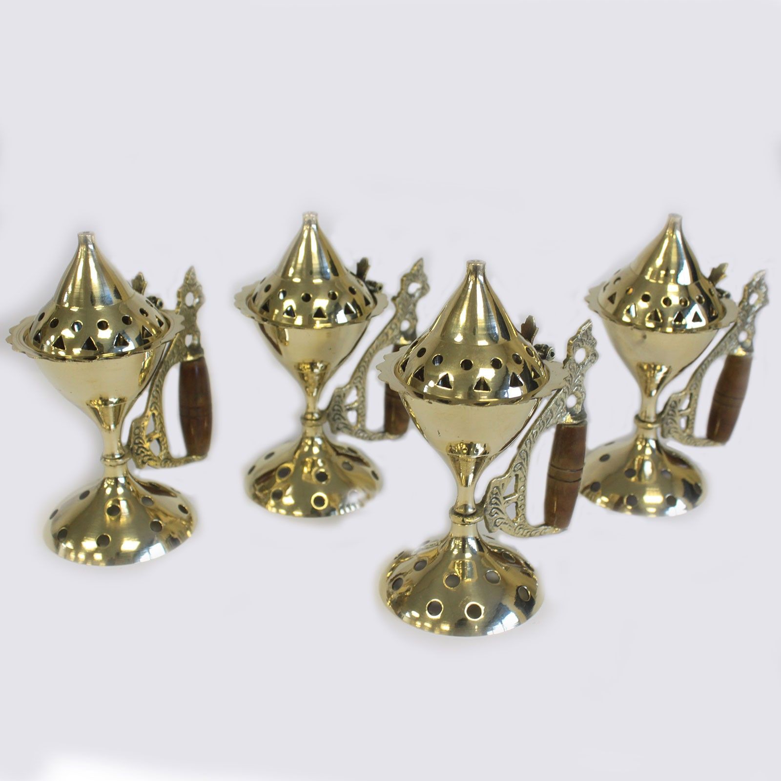 This polished brass cone burner with a wooden handle is perfect for burning incense cones or small charcoal. With its elegant design, vented lid, and sturdy base, it’s both practical and decorative, ideal for home fragrance, rituals, or meditation.