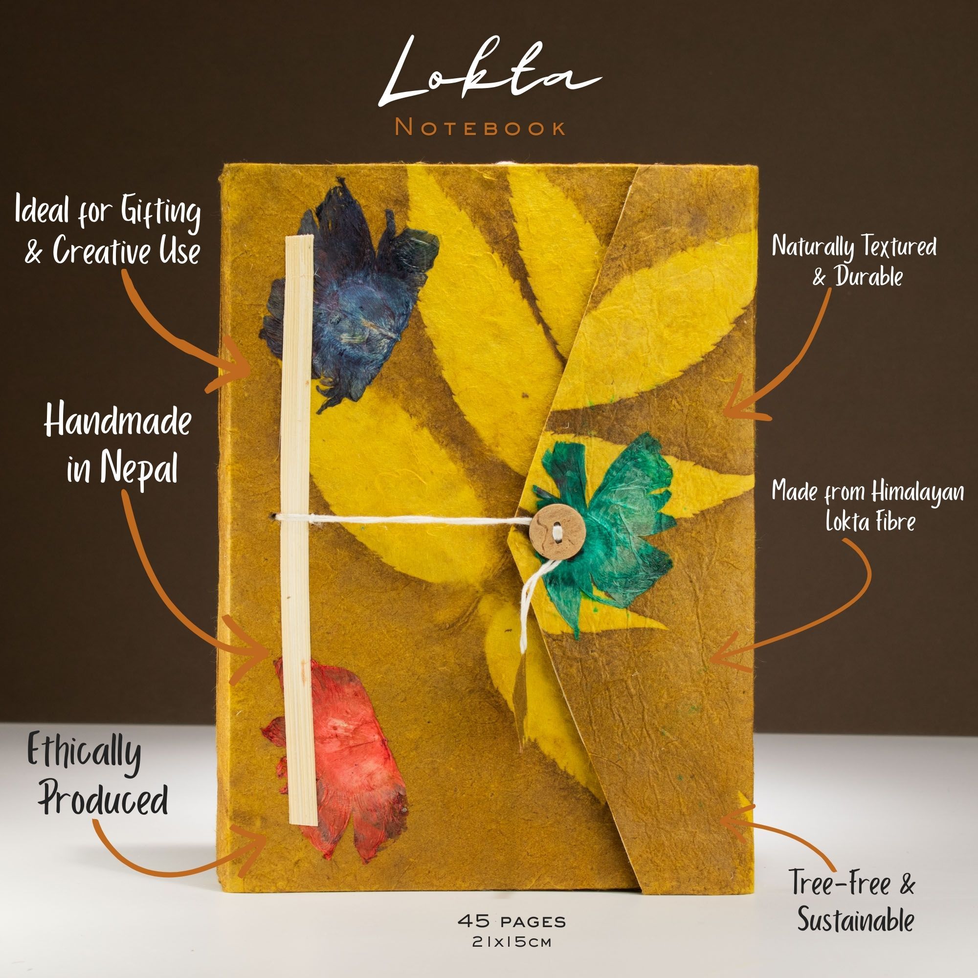 Lokta Bold Floral Notebook – Large (21x15cm) – 45 Leaves – Includes Bookmark – Olive