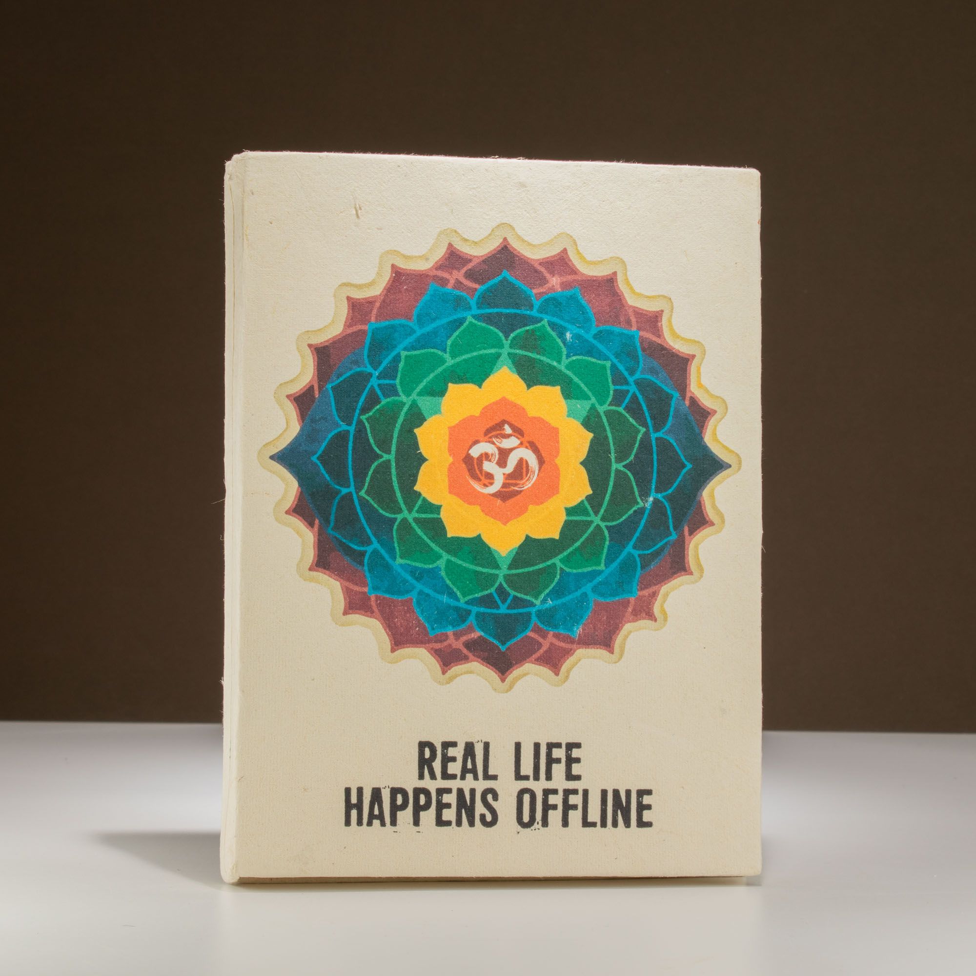 This large Lokta notebook speaks to the modern need for slow living and digital disconnection. With its bold “Real Life Happens Offline” message and vibrant mandala-inspired artwork, it makes a striking statement both visually and philosophically.