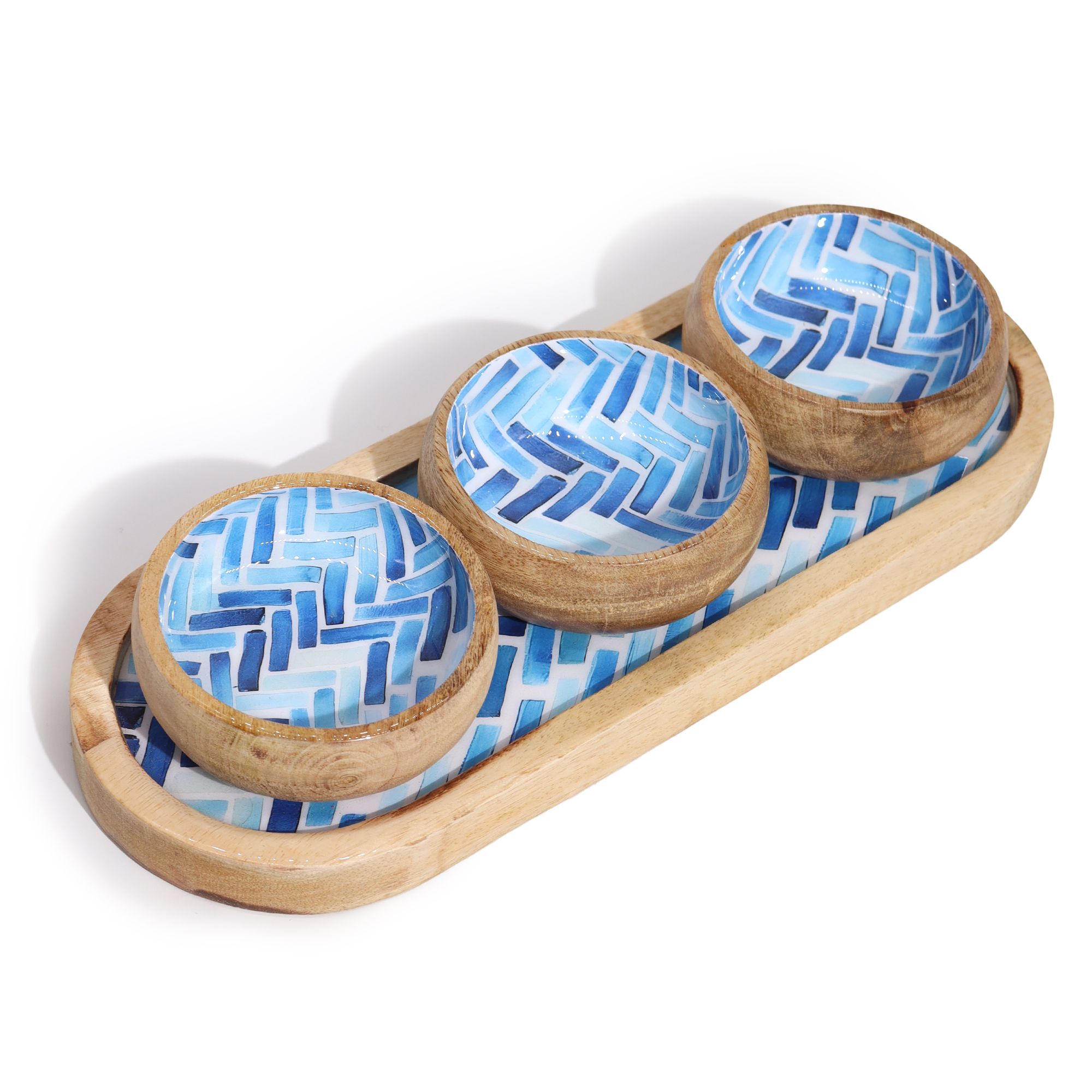 Mango Wood Tray with 3 Bowls – Blue Stripes