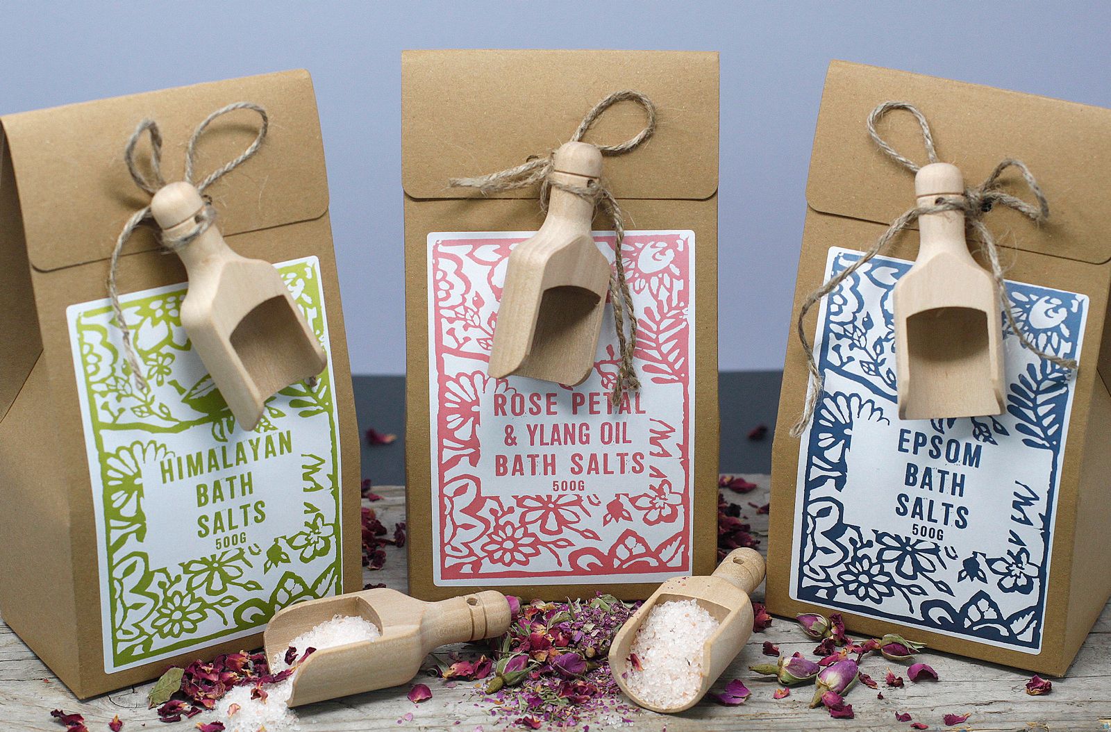 Embrace the ancient wisdom of salt baths, cherished for their remarkable health benefits since the days of ancient Greece. The 500g bags of bath salts come elegantly packaged in a box, complete with a convenient wooden scoop for precise measurements, making them a thoughtful gift for any occasion.
